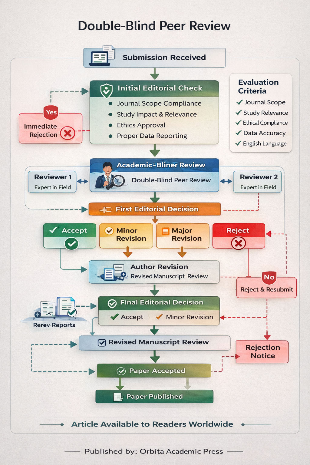 All manuscripts submitted to journals published by Orbita Academic Press undergo a structured editorial and peer review process to ensure academic quality, originality, and ethical integrity. Each submission is first evaluated by the editorial office for compliance with the journal’s scope, author guidelines, and ethical standards. Manuscripts that pass the initial screening are then sent to independent experts for a double-blind peer review, where the identities of authors and reviewers remain confidential.